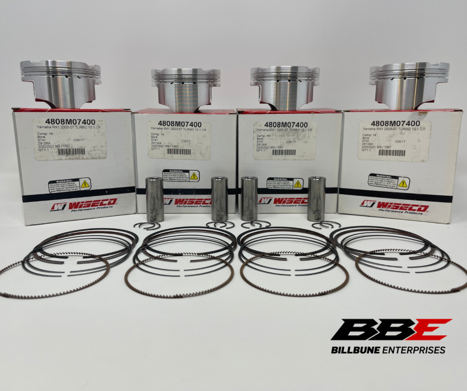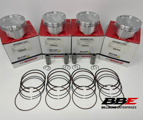 Wiseco standard / stock 74.00mm bore piston kits. 10:1 Compression ratio. Includes (4) pistons, (4) sets of rings, (4) pins, (4) pairs of c-clips.