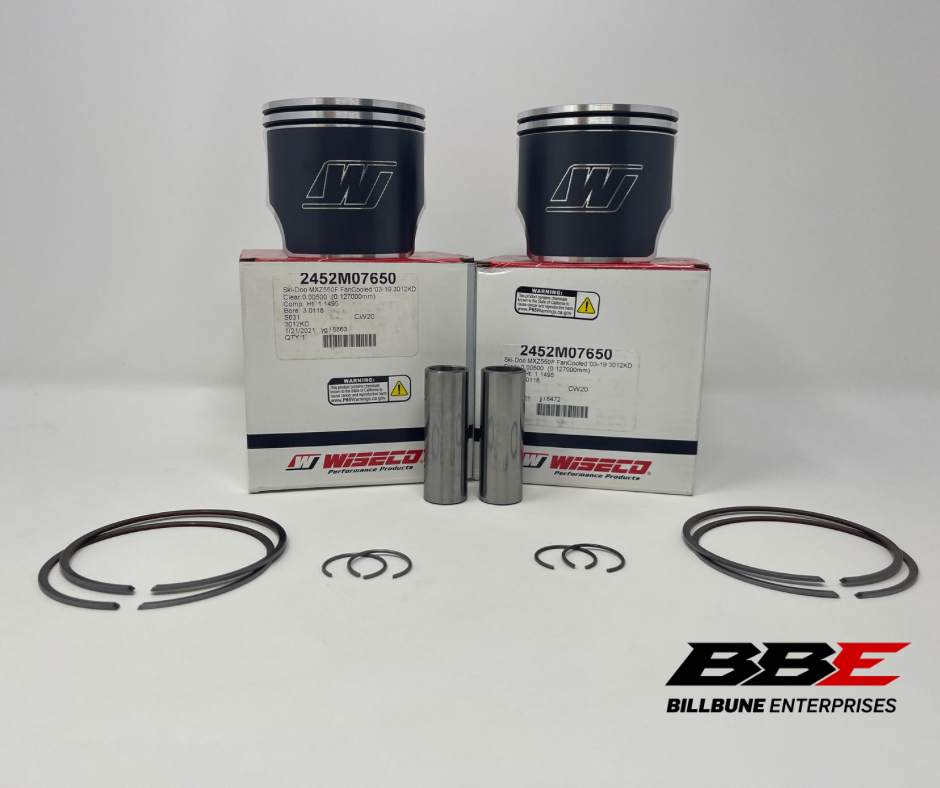 Wiseco .50mm / .020” Oversized 76.50mm Bore Piston Kits. Includes (2) Pistons, (2) Sets of Rings, (2) Pins, (2) Pairs of C-Clips.