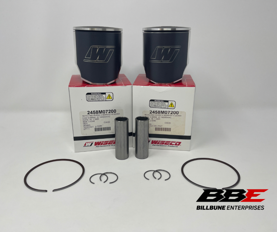 Wiseco standard / stock 72.00mm bore piston kits. Includes (2) pistons, (2) sets of rings, (2) pins, (2) pairs of c-clips.