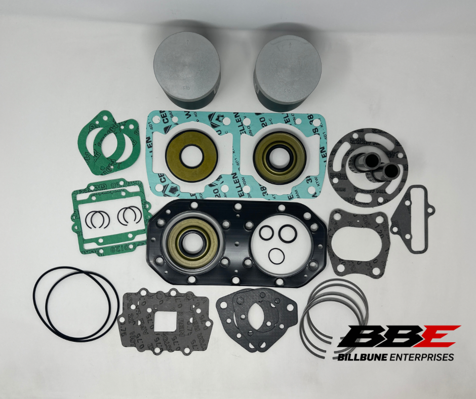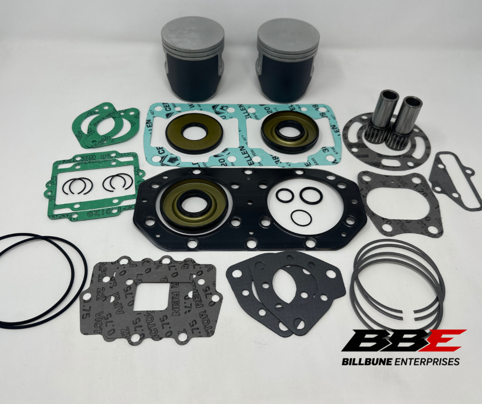 WSM platinum coated .75mm / .030” Oversized 80.75mm bore Engine Rebuild kit. Includes (2) pistons, (2) sets of rings, (2) pins, (2) clips, (2) top end bearings, and (1) Engine gasket set With Seals.