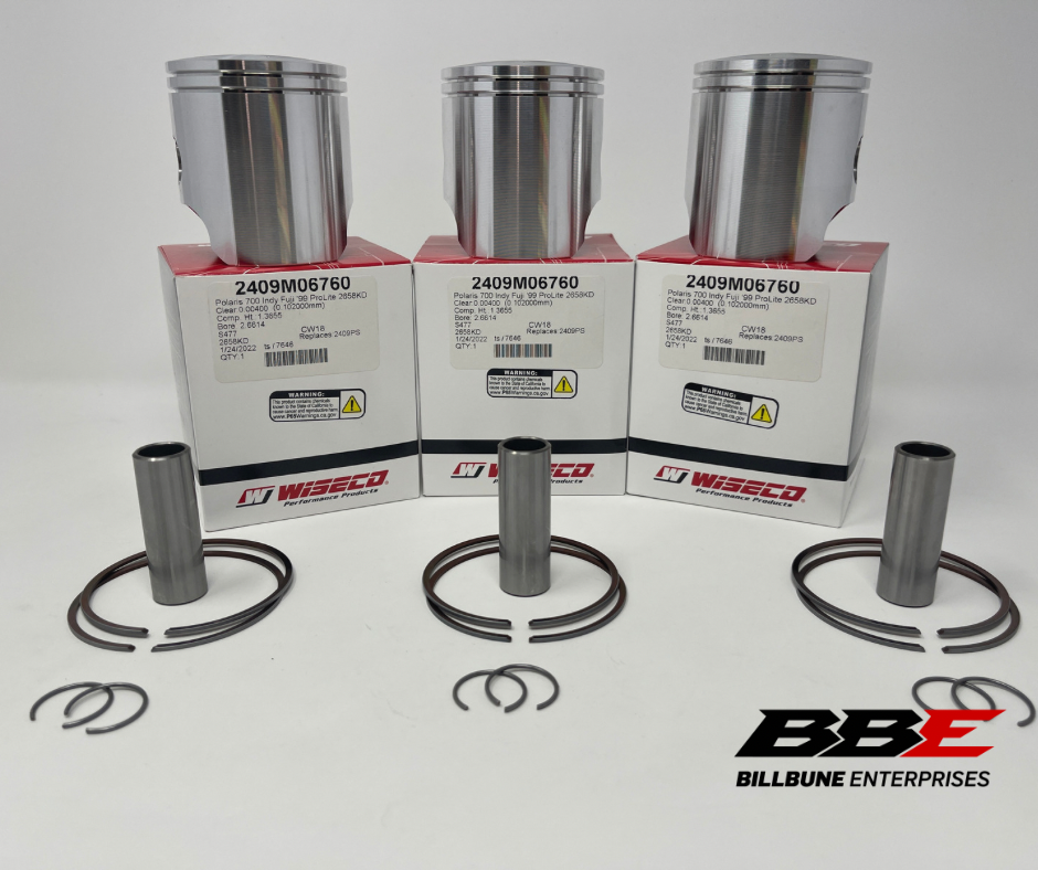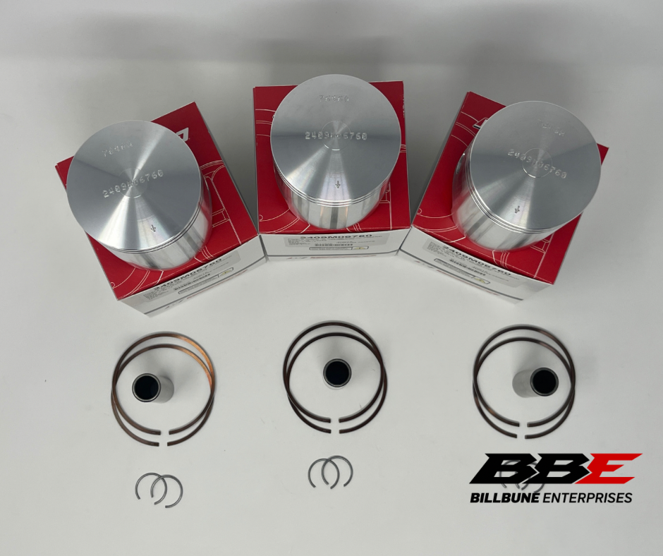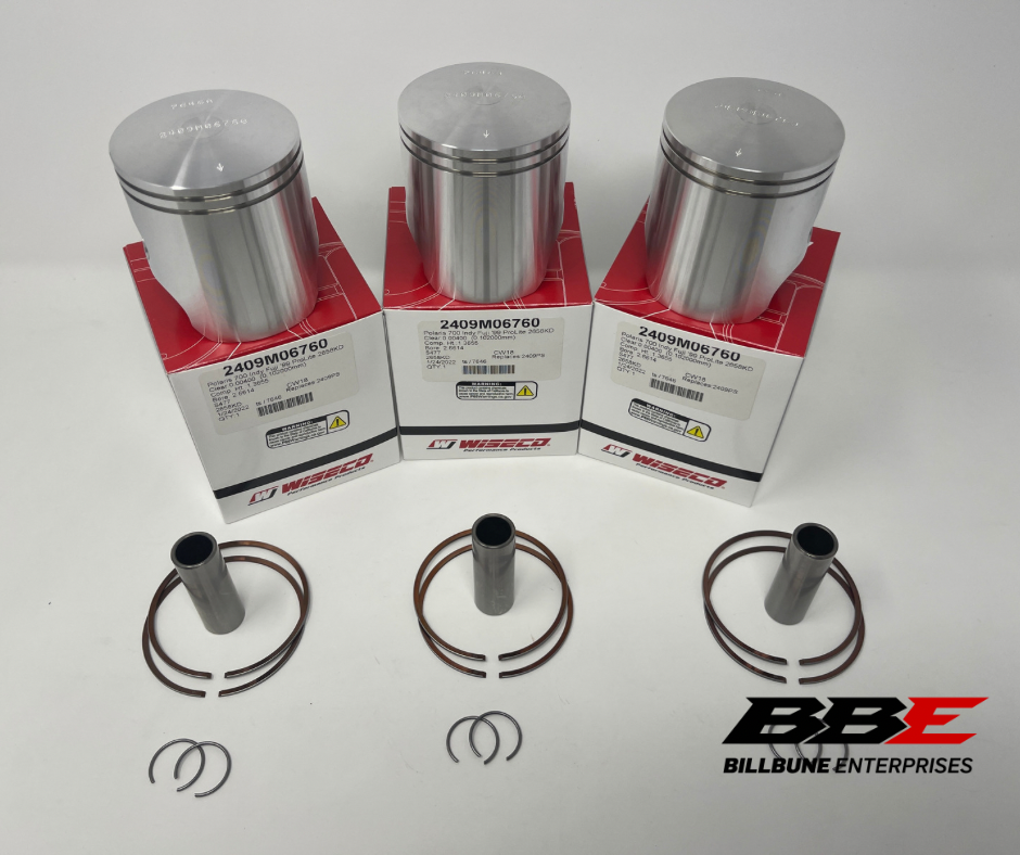 Wiseco Standard / Stock 67.60mm Bore Piston Kits. Includes (3) Pistons, (3) Sets of Rings, (3) Pins, (3) Pairs of C-Clips.