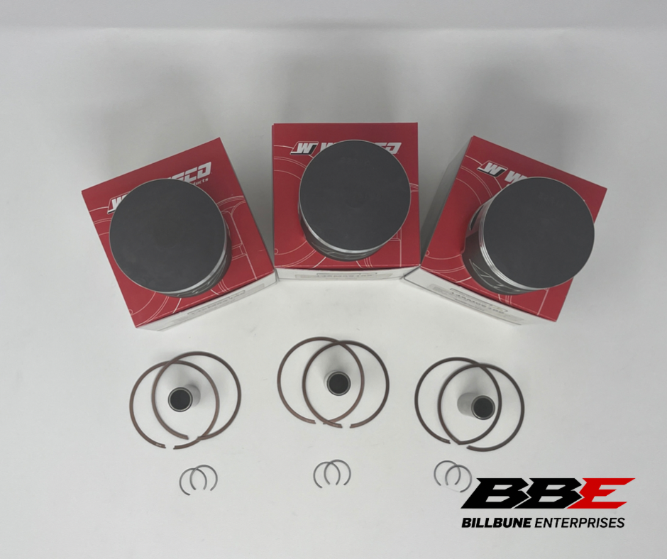 Wiseco 1.00mm / .040" oversized 61.00mm bore piston kits. Includes (3) pistons, (3) sets of rings, (3) pins, (3) pairs of clips.