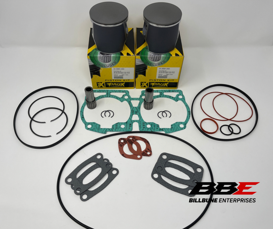 ProX .50mm / .020" Oversized 76.50mm Bore Piston Kits and Top End Gasket Set. Includes (2) Pistons, (2) Sets of Rings, (2) Pins, (2) Pairs of C-Clip, (2) Top End Bearings, and (1) Top End Gasket Set.