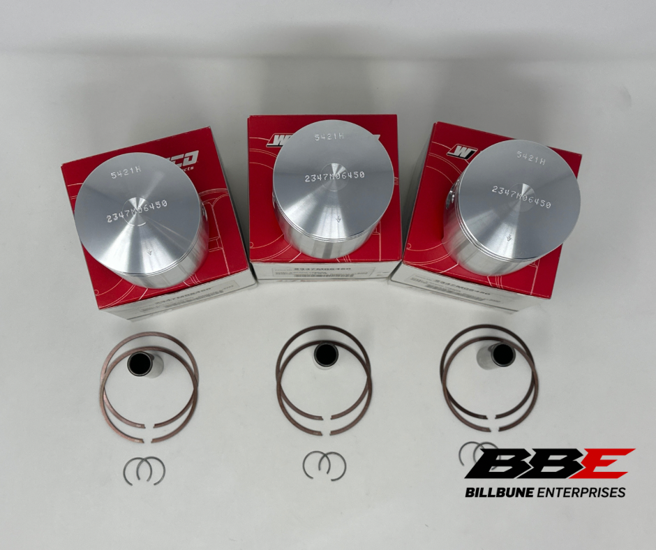 Wiseco .50mm / .020" oversized 64.50mm bore piston kits. Includes (3) pistons, (3) sets of rings, (3) pins, and (3) pairs of clips.