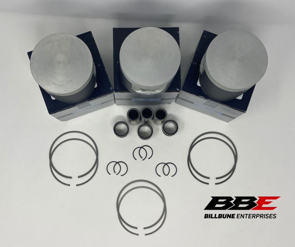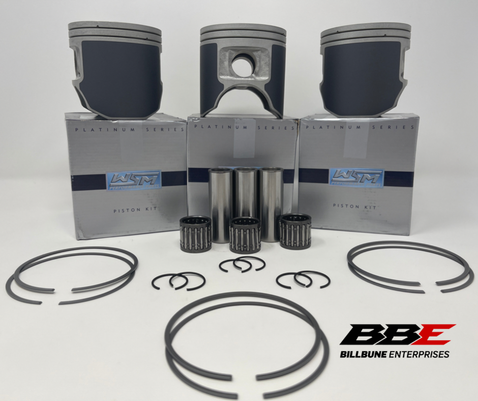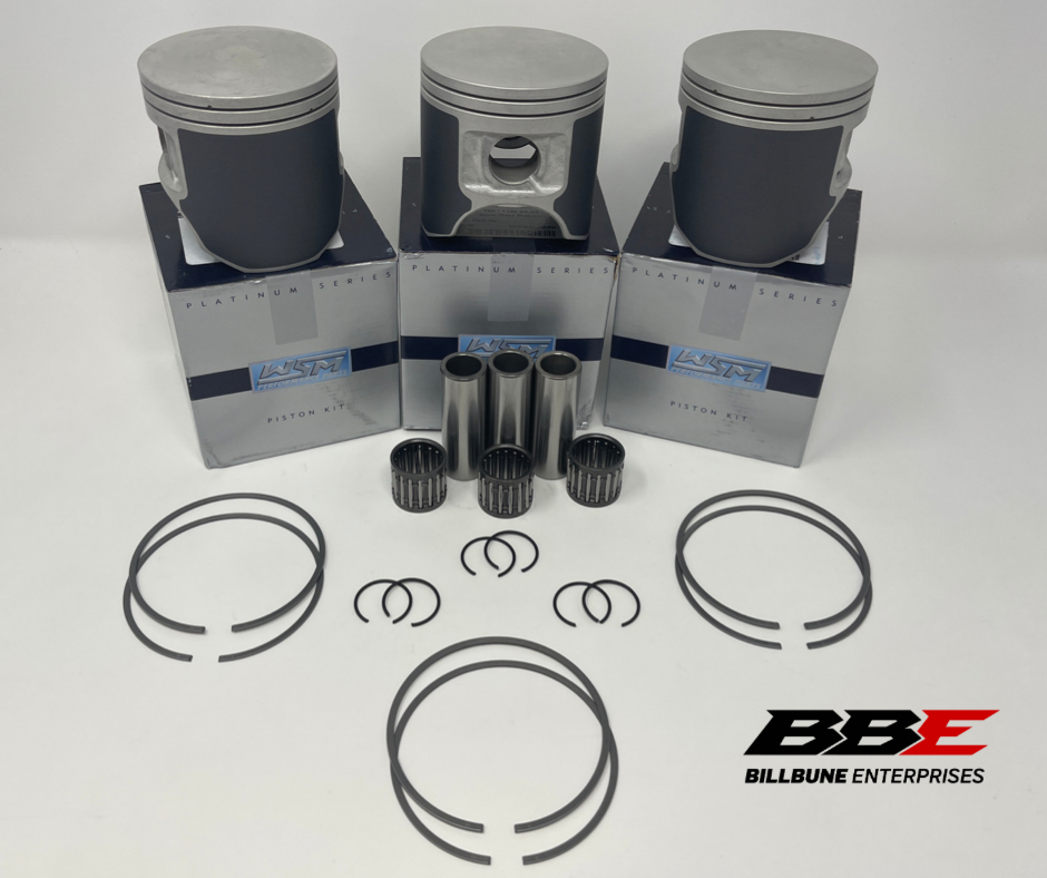 WSM platinum coated .50mm / .020" oversized 80.50mm bore piston kits. Includes (3) pistons, (3) sets of rings, (3) pins, (3) pairs of clips, and (3) top end bearings.