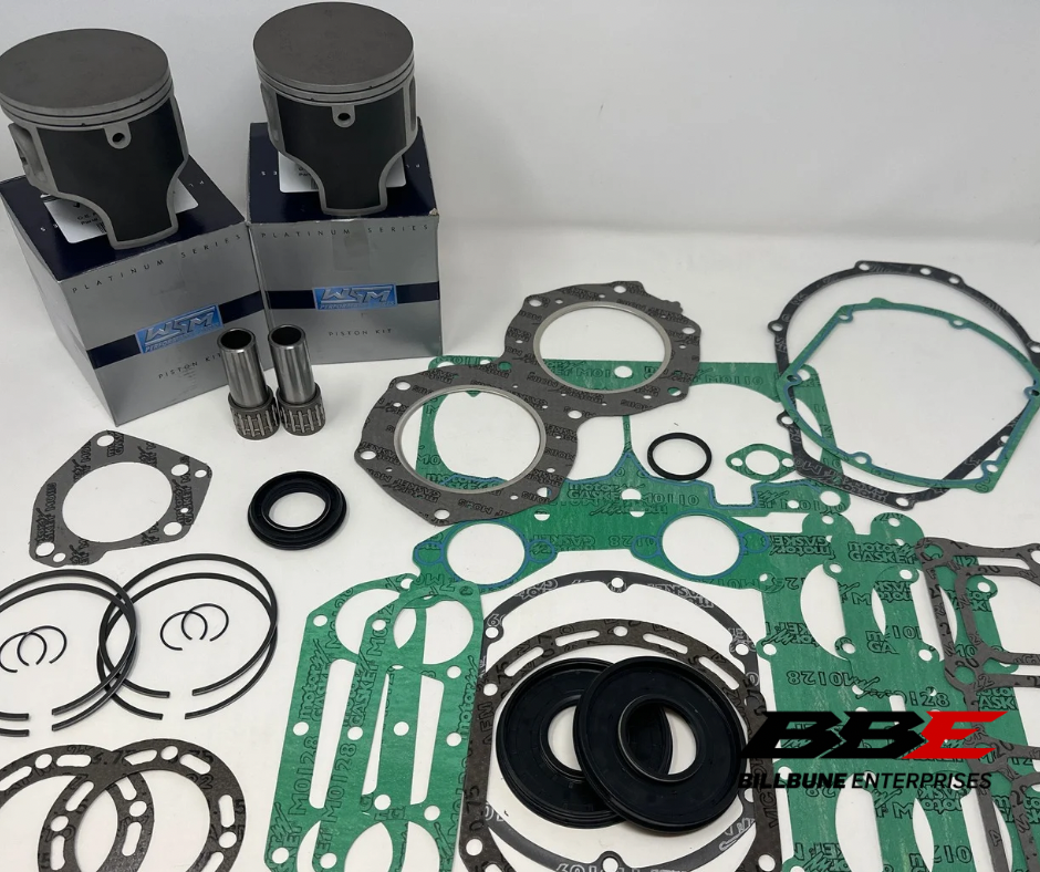 WSM Engine Rebuild Kit. Platinum Coated Piston Kits .25mm / .010” Oversized 81.25mm Bore Piston Kits and Complete Gasket Set With Crankshaft Oil Seals. Includes (2) Pistons, (2) Sets of Rings, (2) Pins, (2) Pairs of Clips, (2) Top End Bearings, and (1) Engine Gasket Set With Seals.