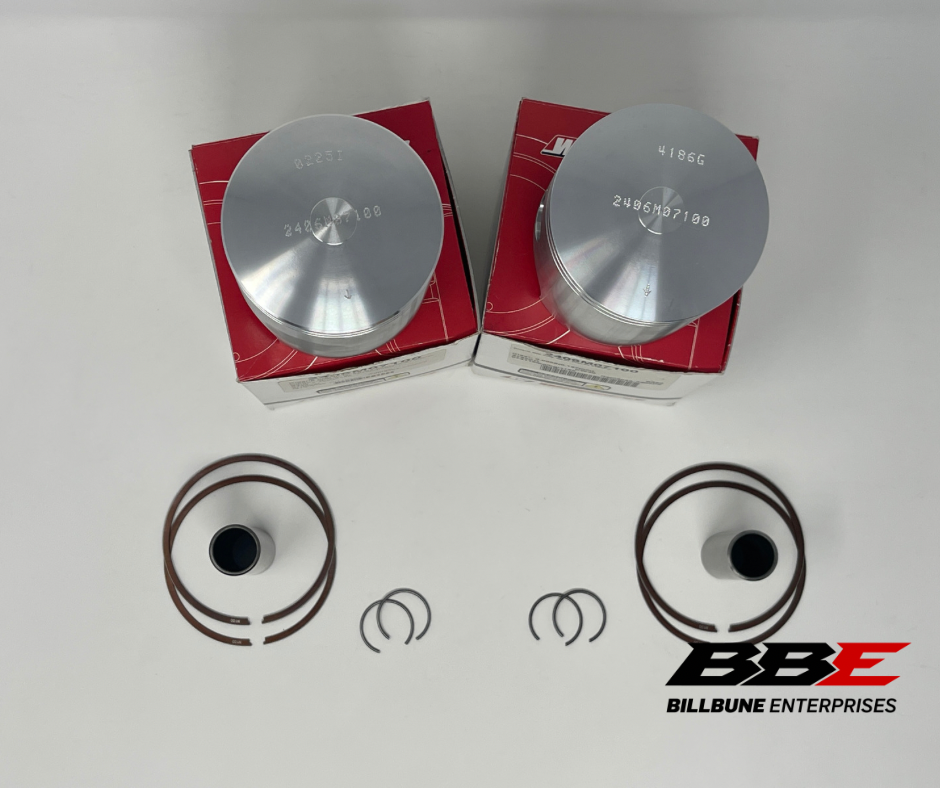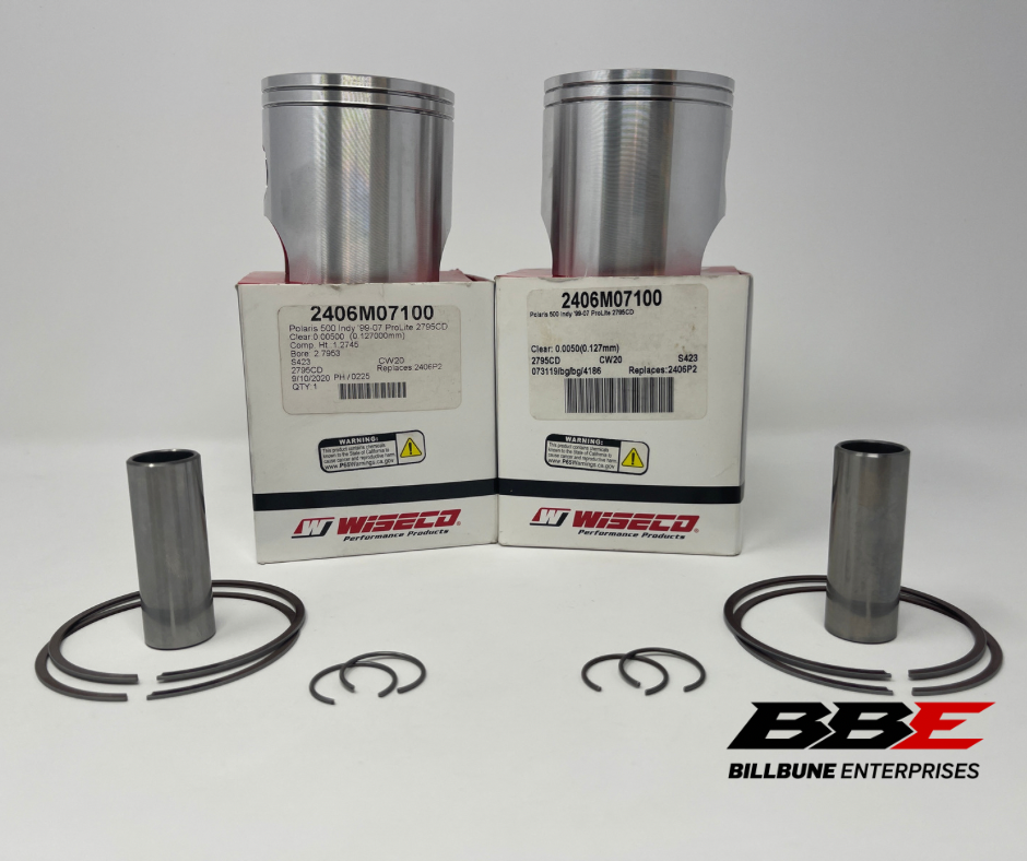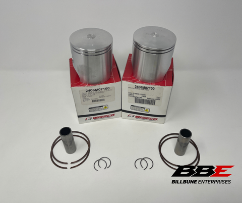 Wiseco .50mm / .020” Oversized 71.00mm Bore Piston Kits. Includes (2) Pistons, (2) Sets of Rings, (2) Pins, and (2) Pairs of Clips.
