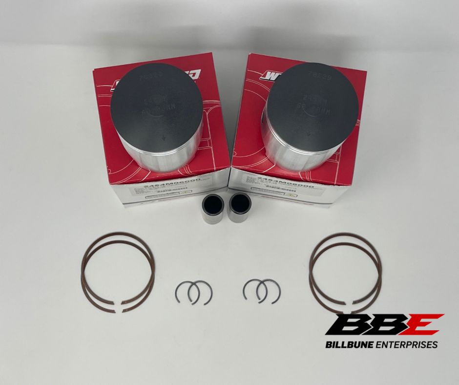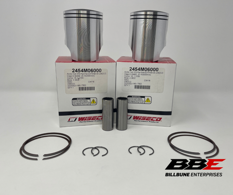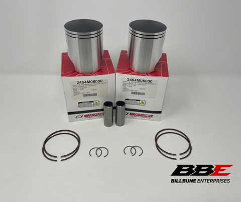 Wiseco Standard / Stock 60.00mm Bore Piston Kits. Includes (2) Pistons, (2) Sets of Rings, (2) Pins, and (2) Pairs of Clips.