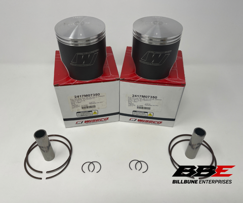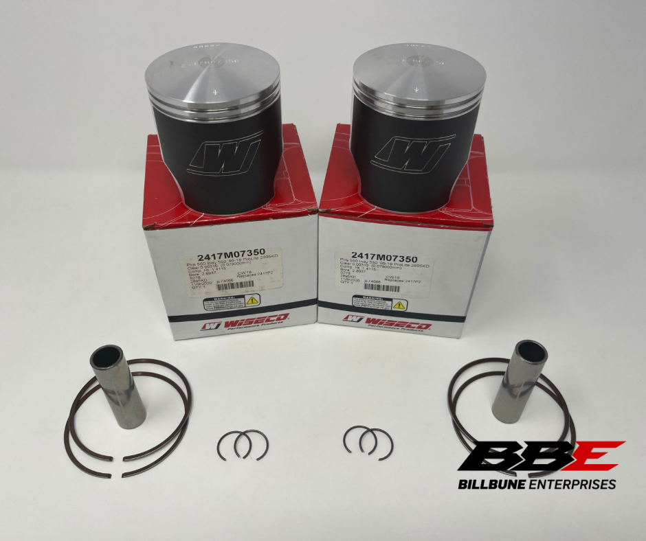 Wiseco .50mm / .020” Oversized 73.50mm Bore Piston Kits. Includes (2) Pistons, (2) Sets of Rings, (2) Pins, (2) Pairs of C-Clips.