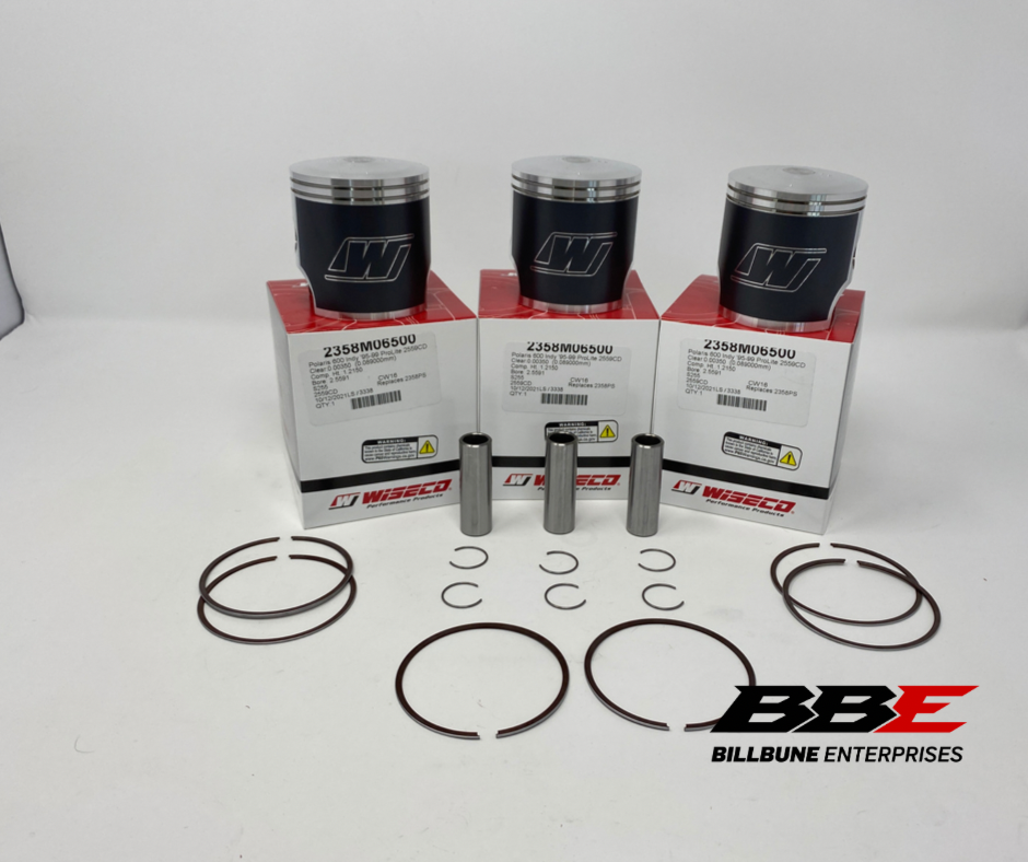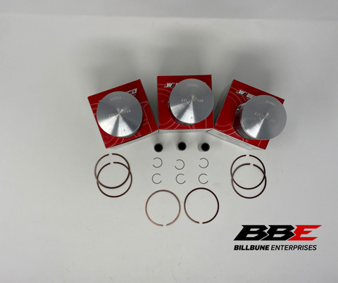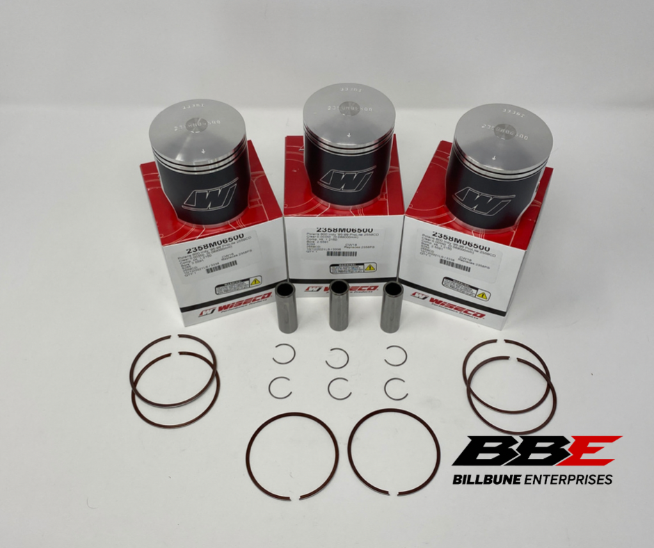 Wiseco Stock / Standard 65.00mm Bore Piston Kits. Includes (3) pistons, (3) sets of rings, (3) pins, and (3) pairs of clips. Top end bearings not included.