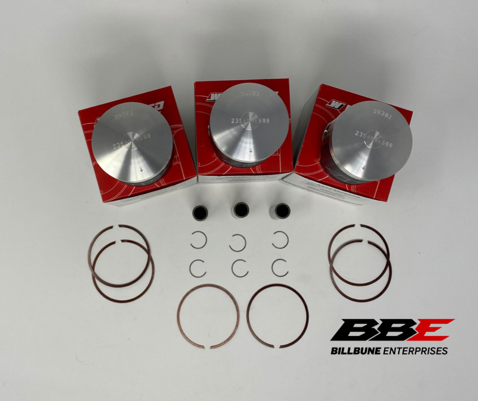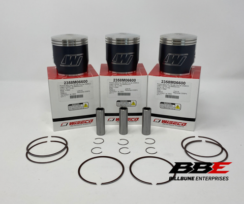 Wiseco 1.00mm / .040" Oversized 66.00mm Bore Piston Kits. Includes (3) pistons, (3) sets of rings, (3) pins, and (3) pairs of clips. Top end bearings not included.