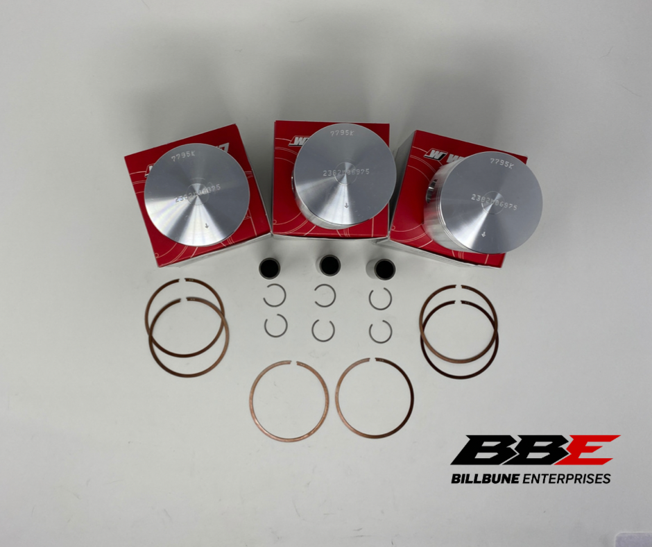 Wiseco Stock / Standard 69.75mm Bore Piston Kits. Includes (3) pistons, (3) sets of rings, (3) pins, and (3) pairs of clips.