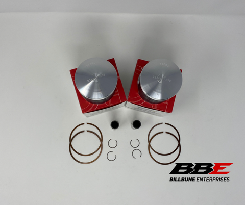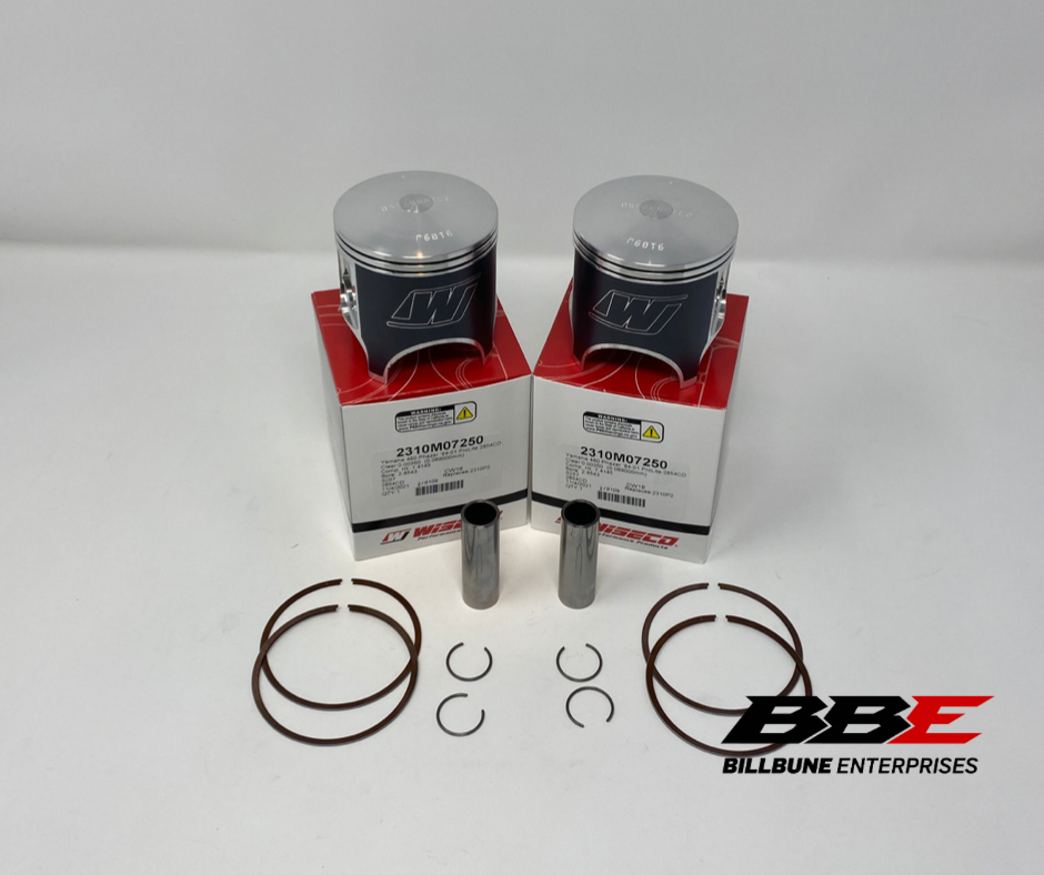 Wiseco .50mm / .020" Oversized 72.50mm Bore Piston Kits. Includes (2) pistons, (2) sets of rings, (2) pins, and (2) pairs of clips. Top end bearings not included.