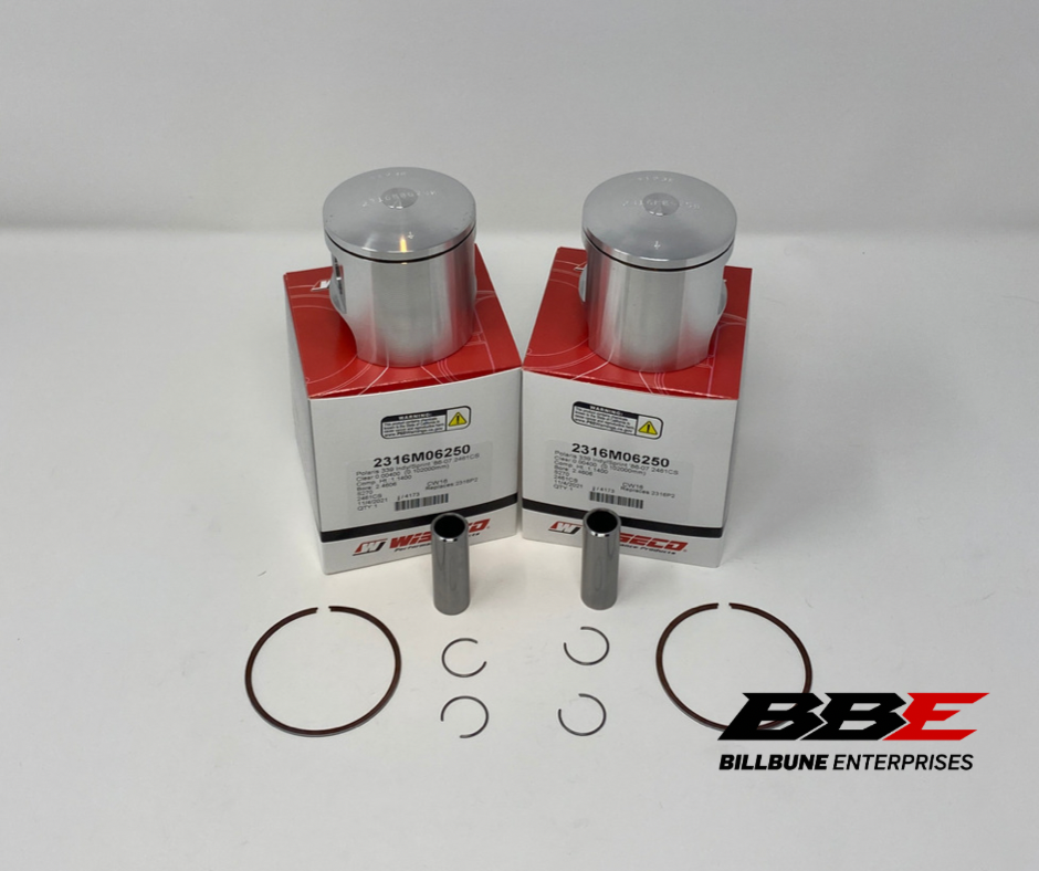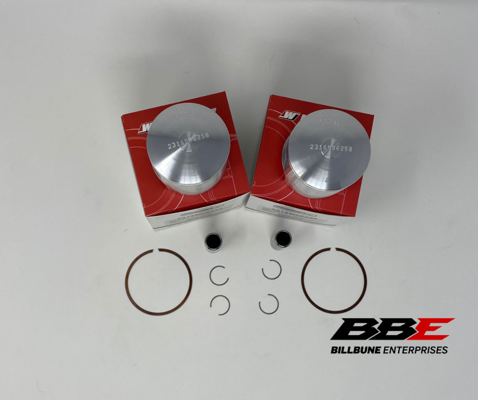 Wiseco .50mm / .020" Oversized 62.50mm Bore Piston Kits. Includes (2) pistons, (2) sets of rings, (2) pins, and (2) pairs of clips. Top end bearings not included.